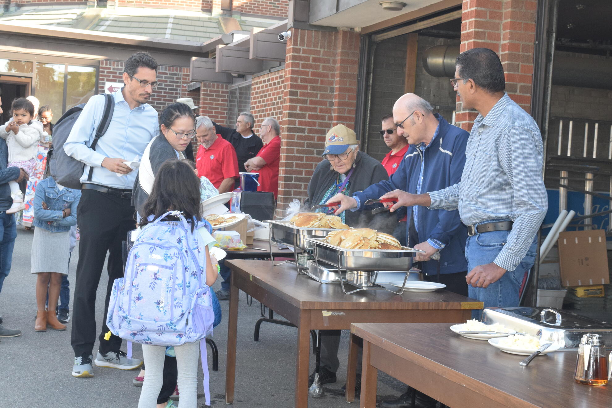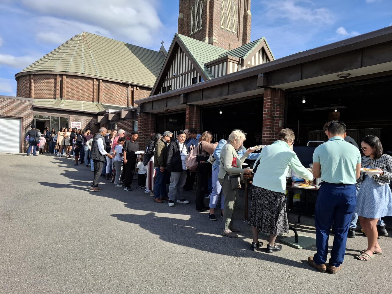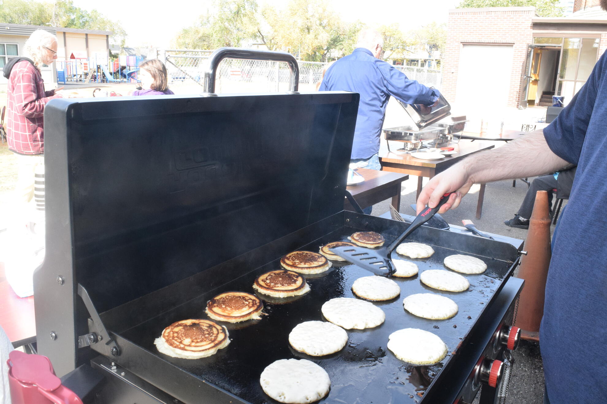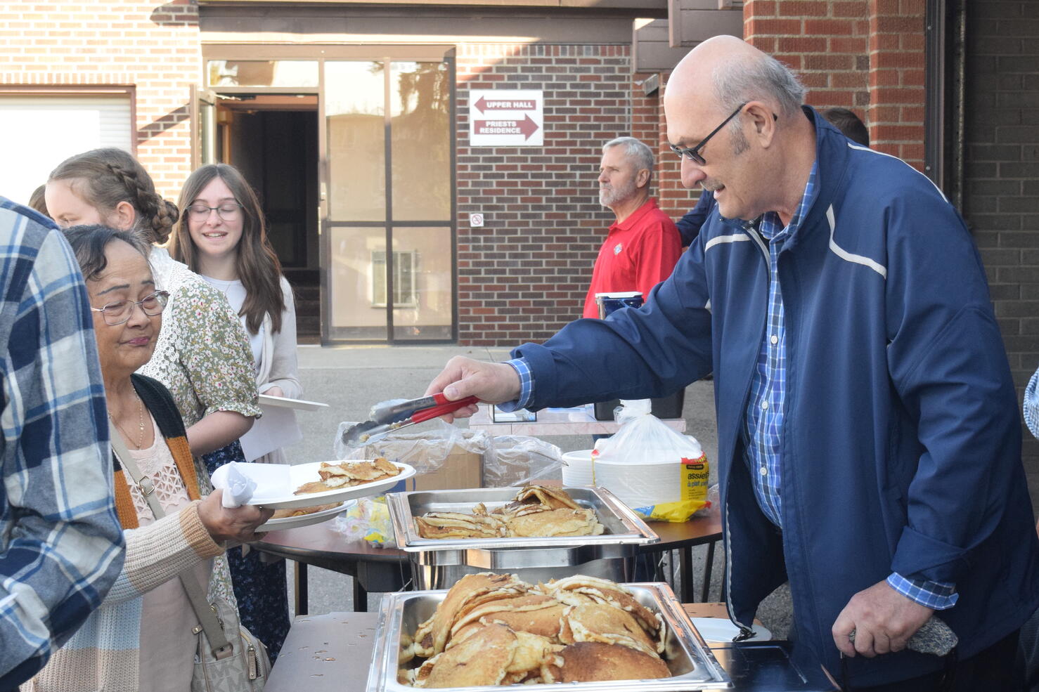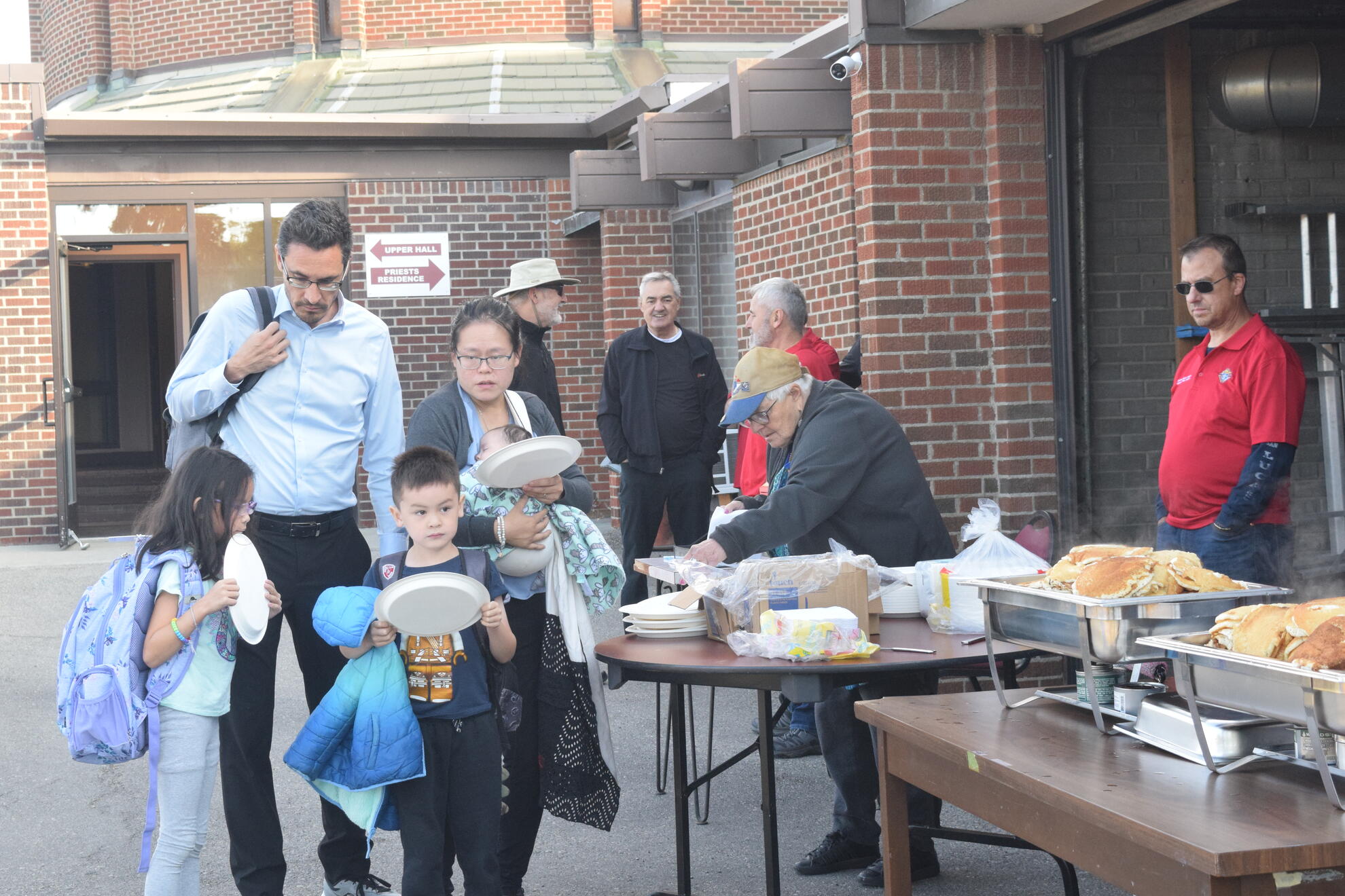 On Sunday, September 28, 2025, our Council hosted a Pancake Breakfast following the 9:00 a.m. and 11:00 a.m. Masses. We welcomed an estimated 250 to 300 parishioners and guests. The morning began cool and mostly cloudy, then brightened toward midday. Temperatures rose from about 6°C after 7 a.m. to the mid-teens by early afternoon, with a steady south breeze. We prepared and served outdoors, and parishioners gathered both in the Upper Hall and on the Sacred Heart Elementary School playground. After the 9 a.m. Mass most lingered inside where it was warmer, while after the 11 a.m. Mass the sunshine drew most people outside to eat in the fresh air.