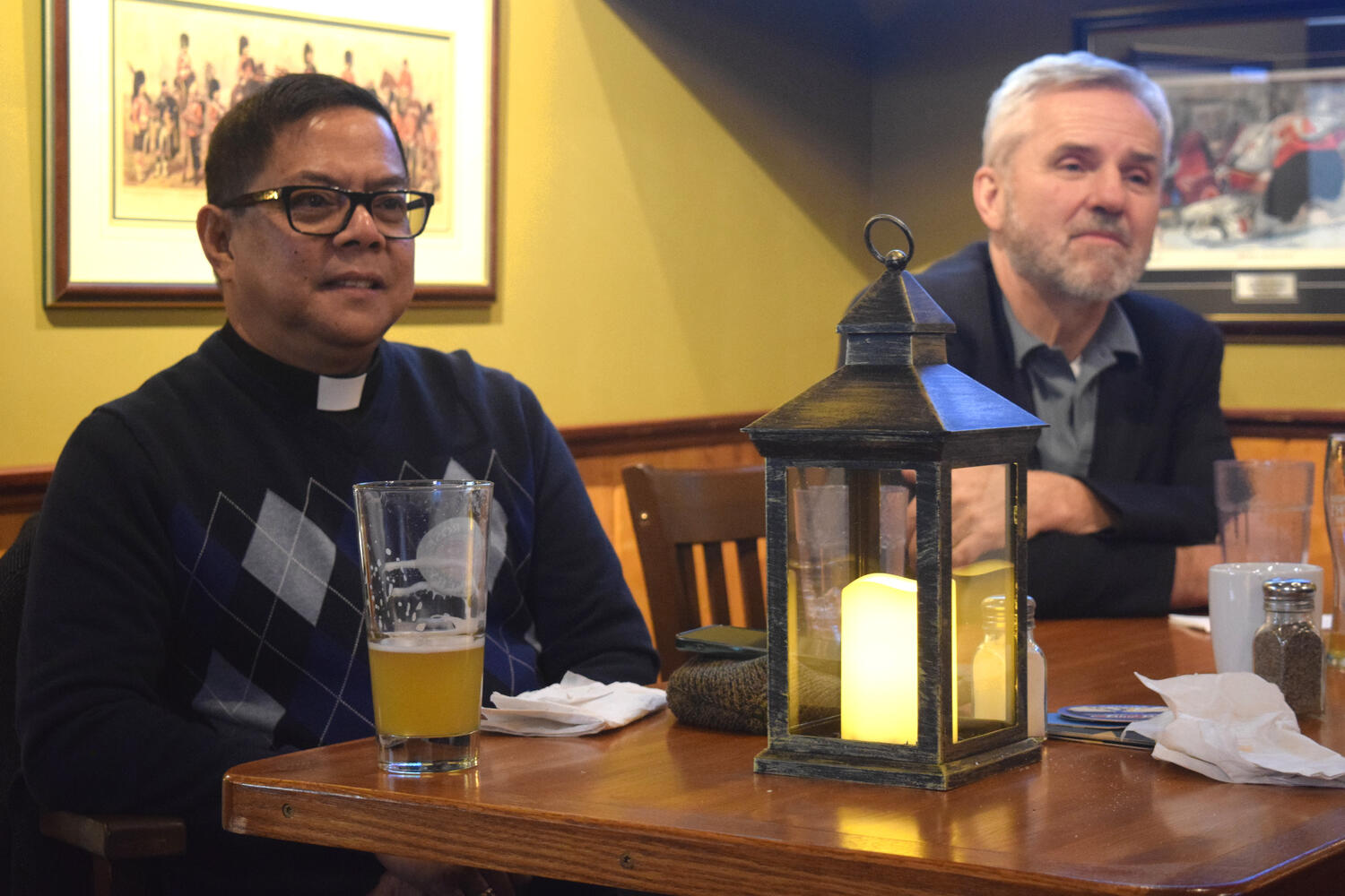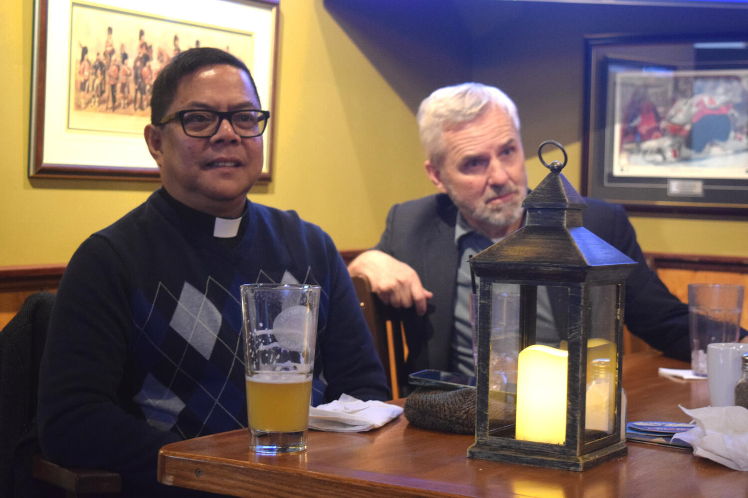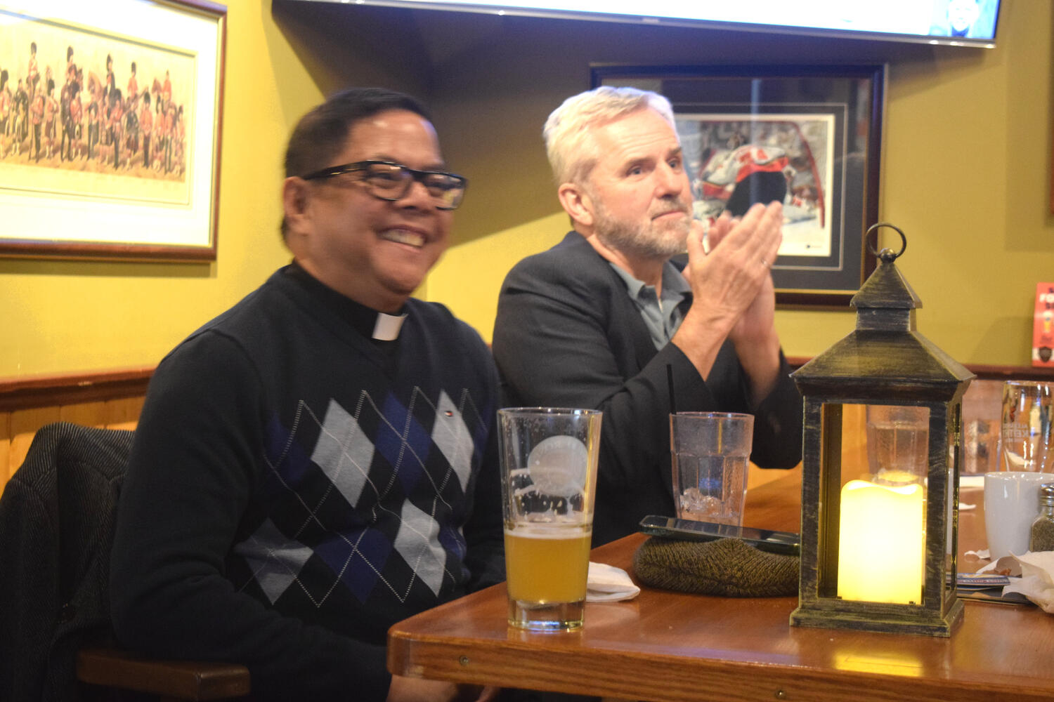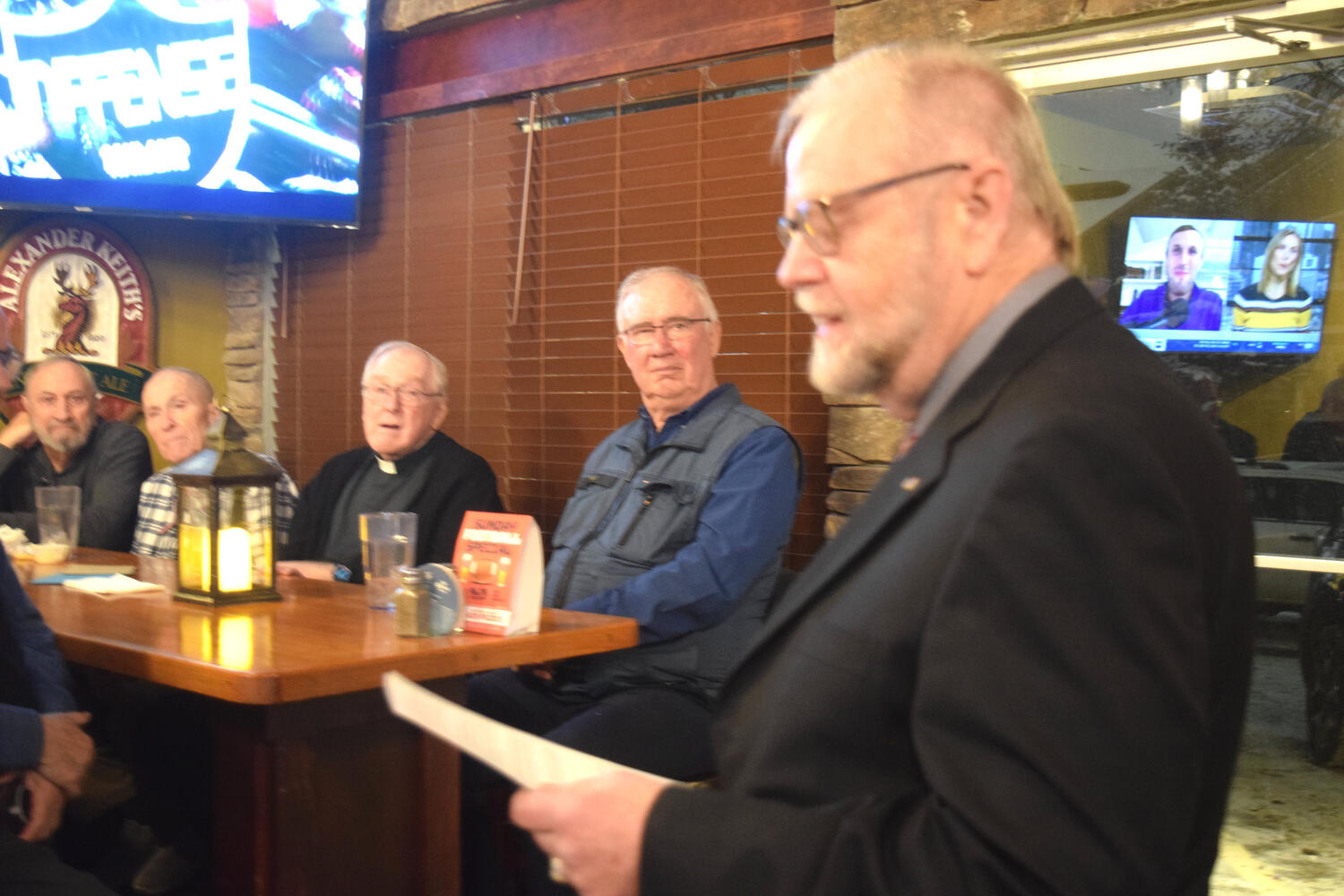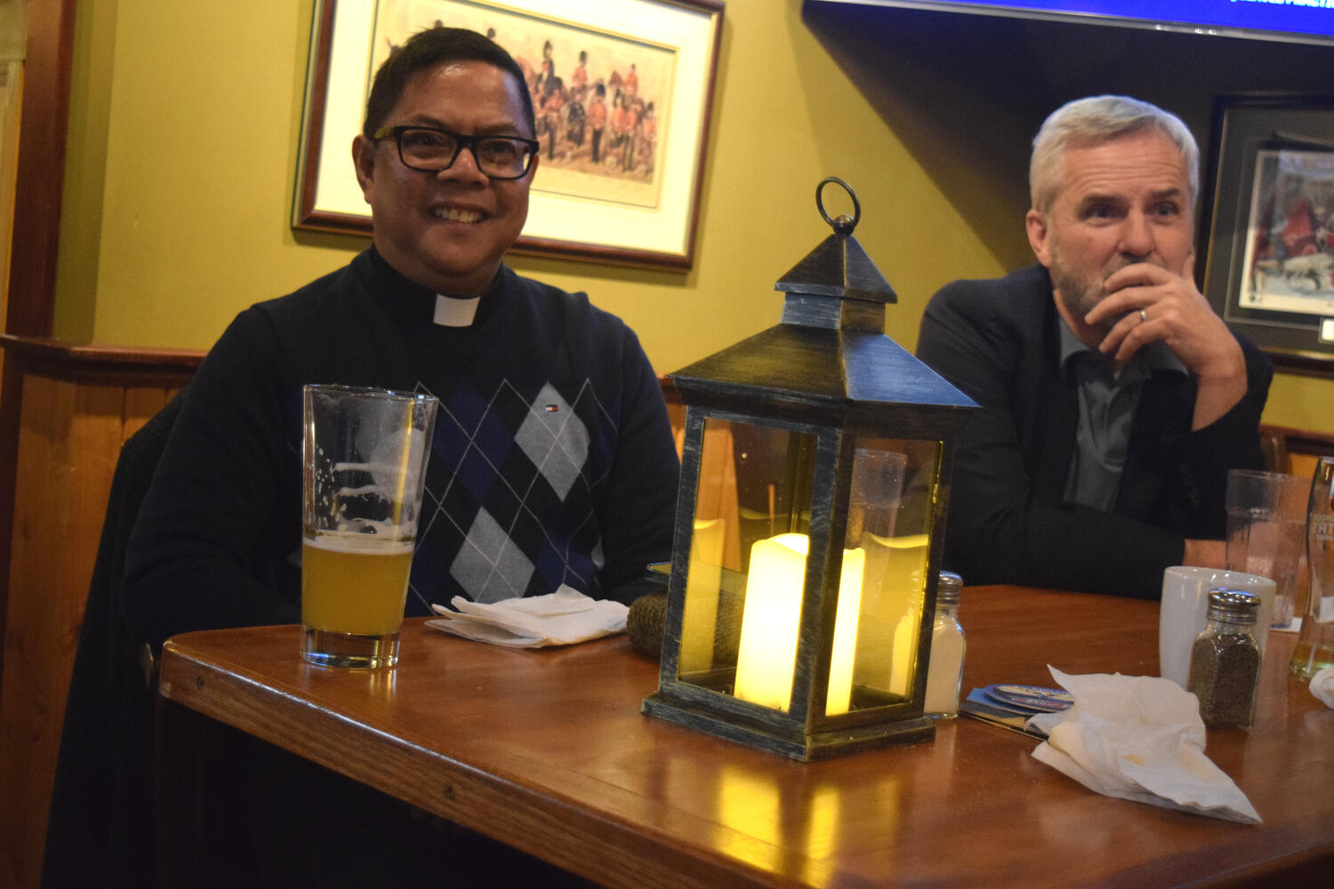 At the Garrison Pub and Eatery, members of Monsignor Doyle Council 1186 gathered to offer prepared tributes and words of thanks to Father Eric and Father Arjay, and to recognize the ninety years of priestly service that their vocations represent.