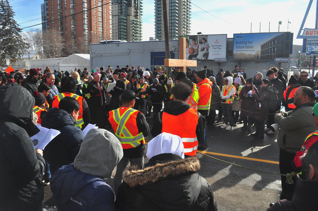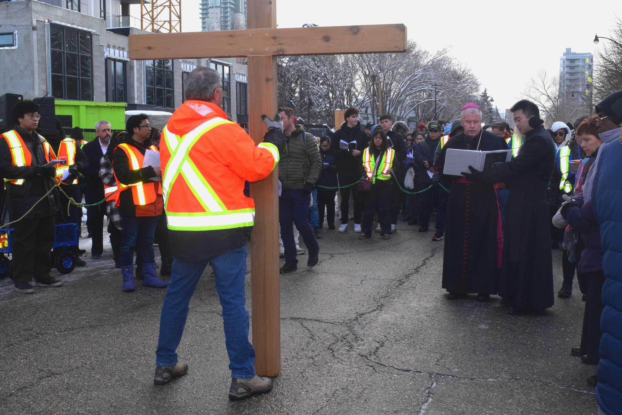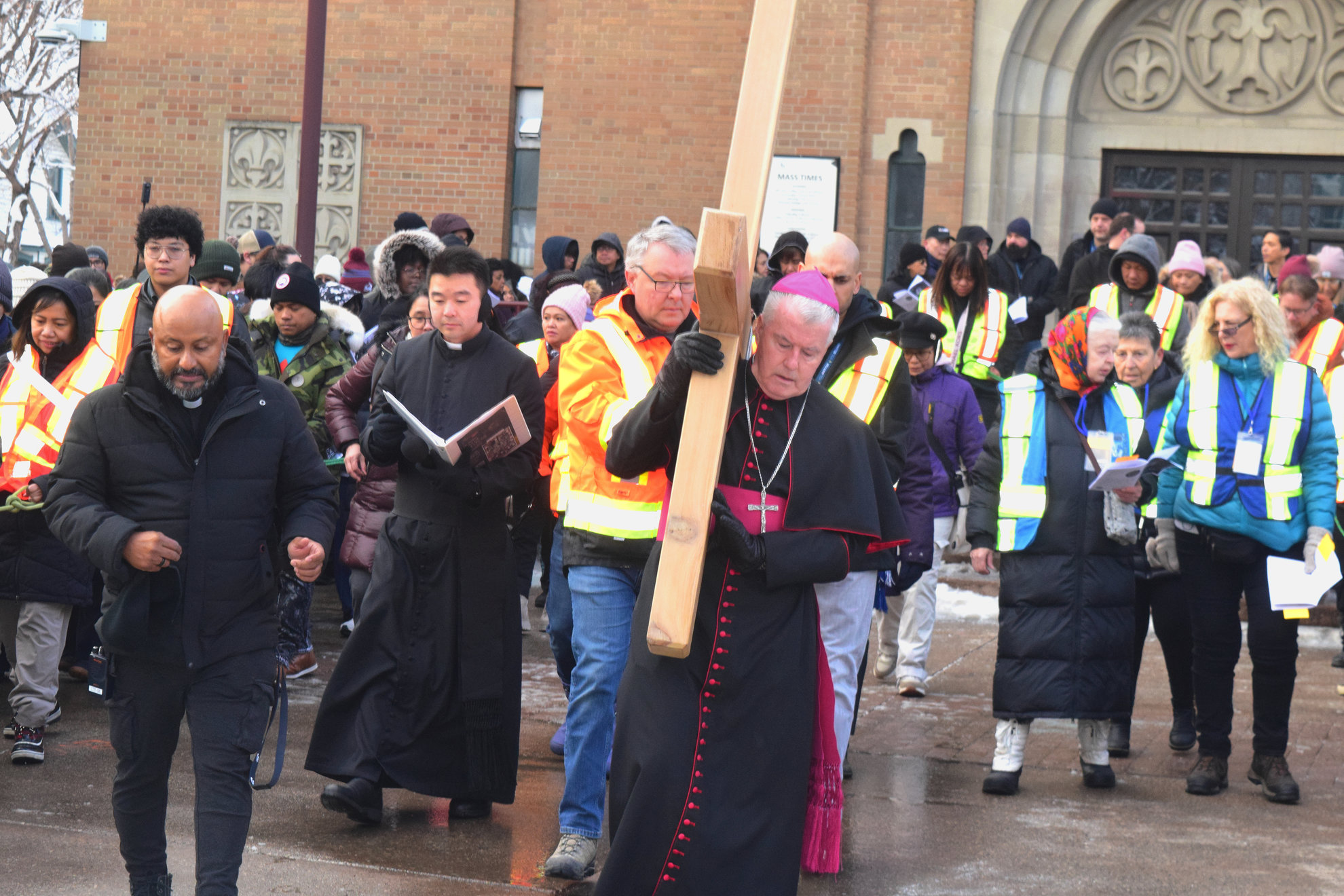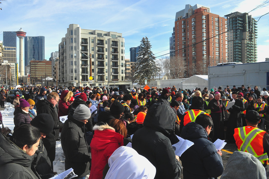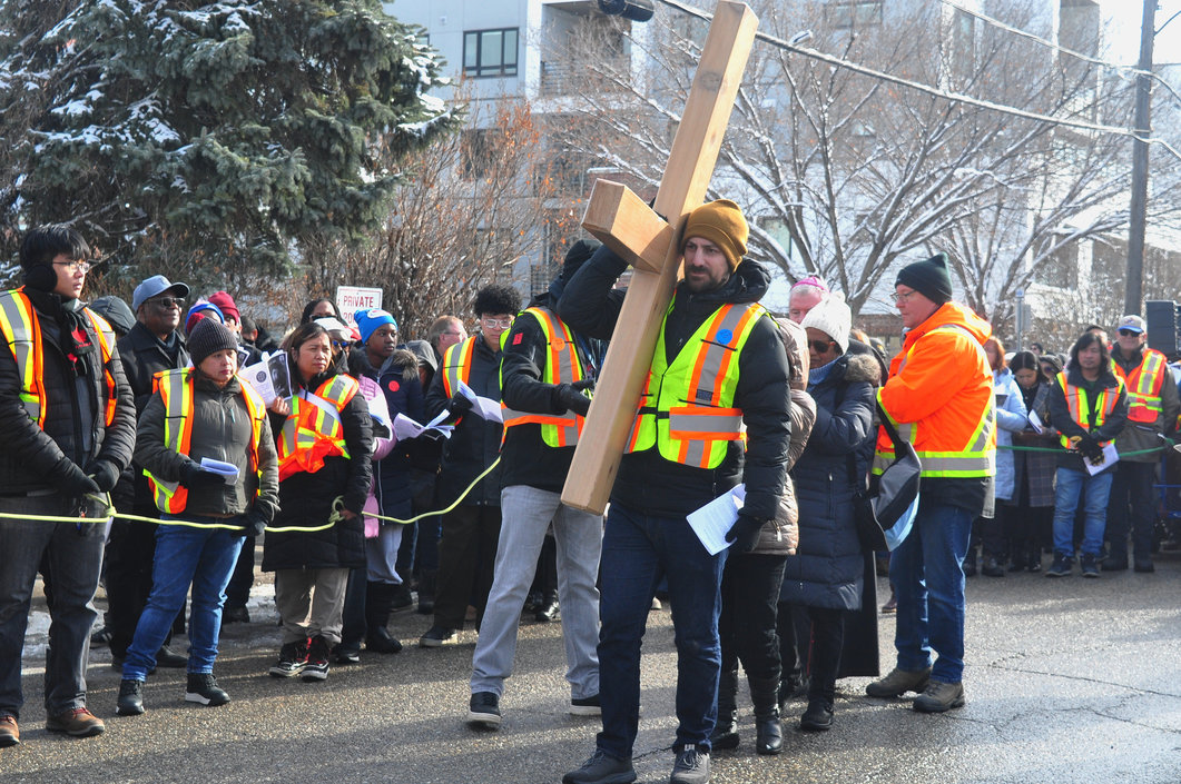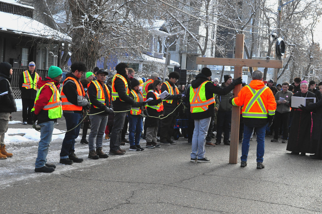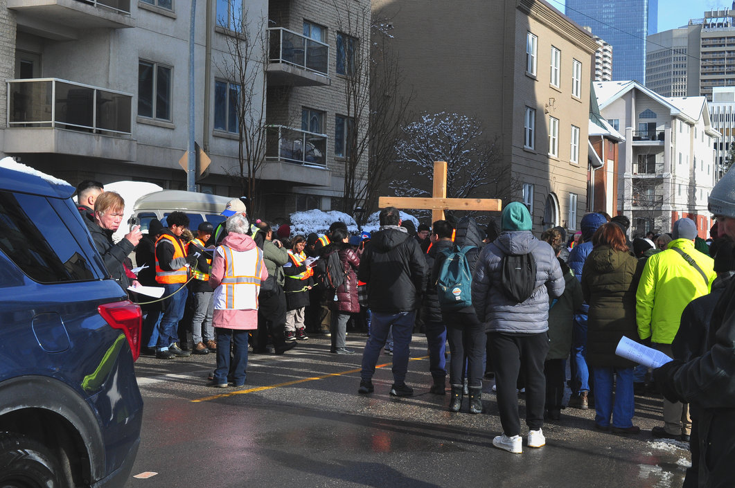 Good Friday morning, April 3rd in downtown Calgary began under cold skies and near-freezing temperatures, but the Outdoor Way of the Cross once again drew a very strong turnout. Attendance was comparable to 2025, with an estimated 2,000 to 3,000 people taking part. Before the procession began, Fr. Arjay led the volunteers in prayer.
