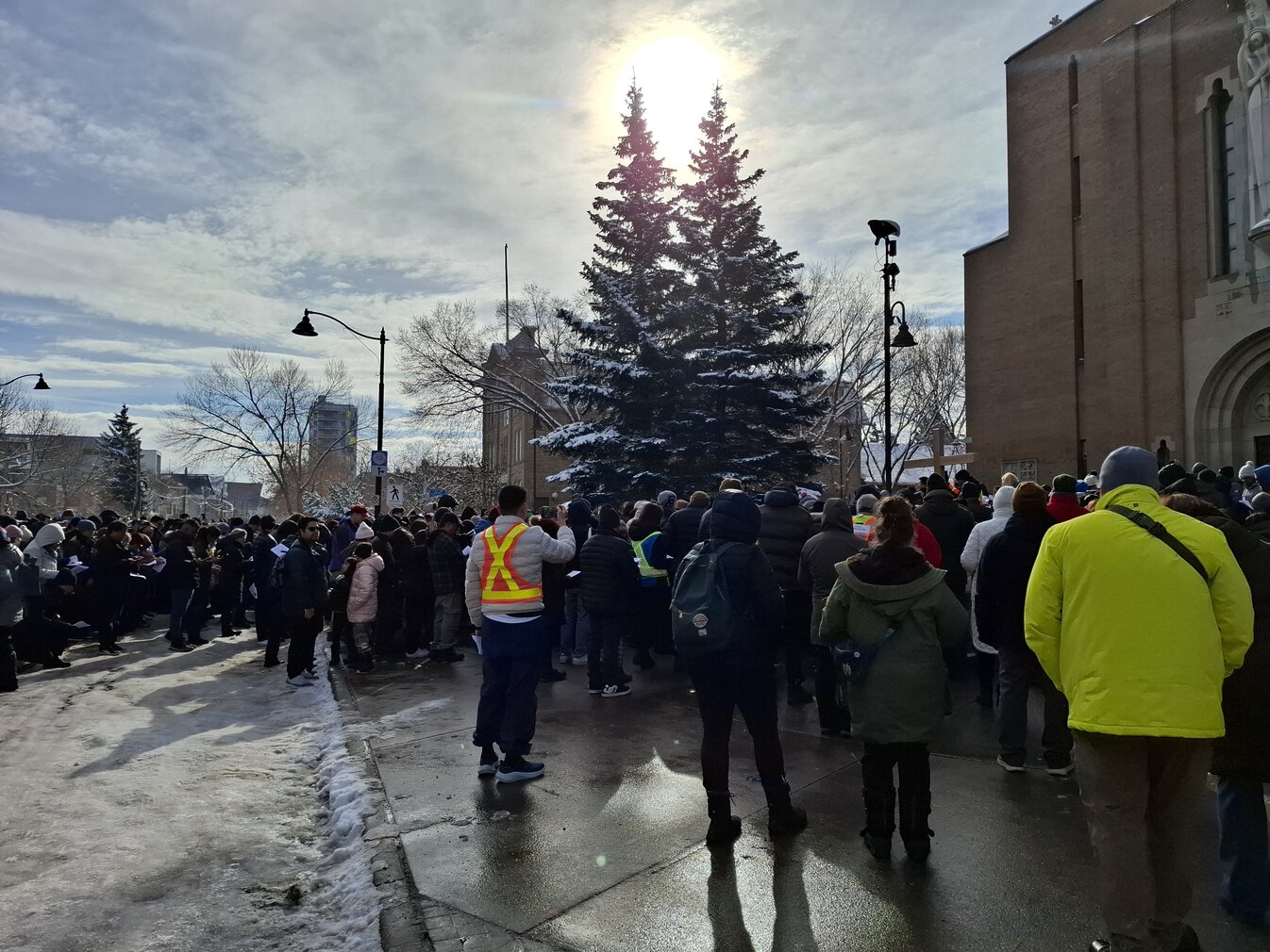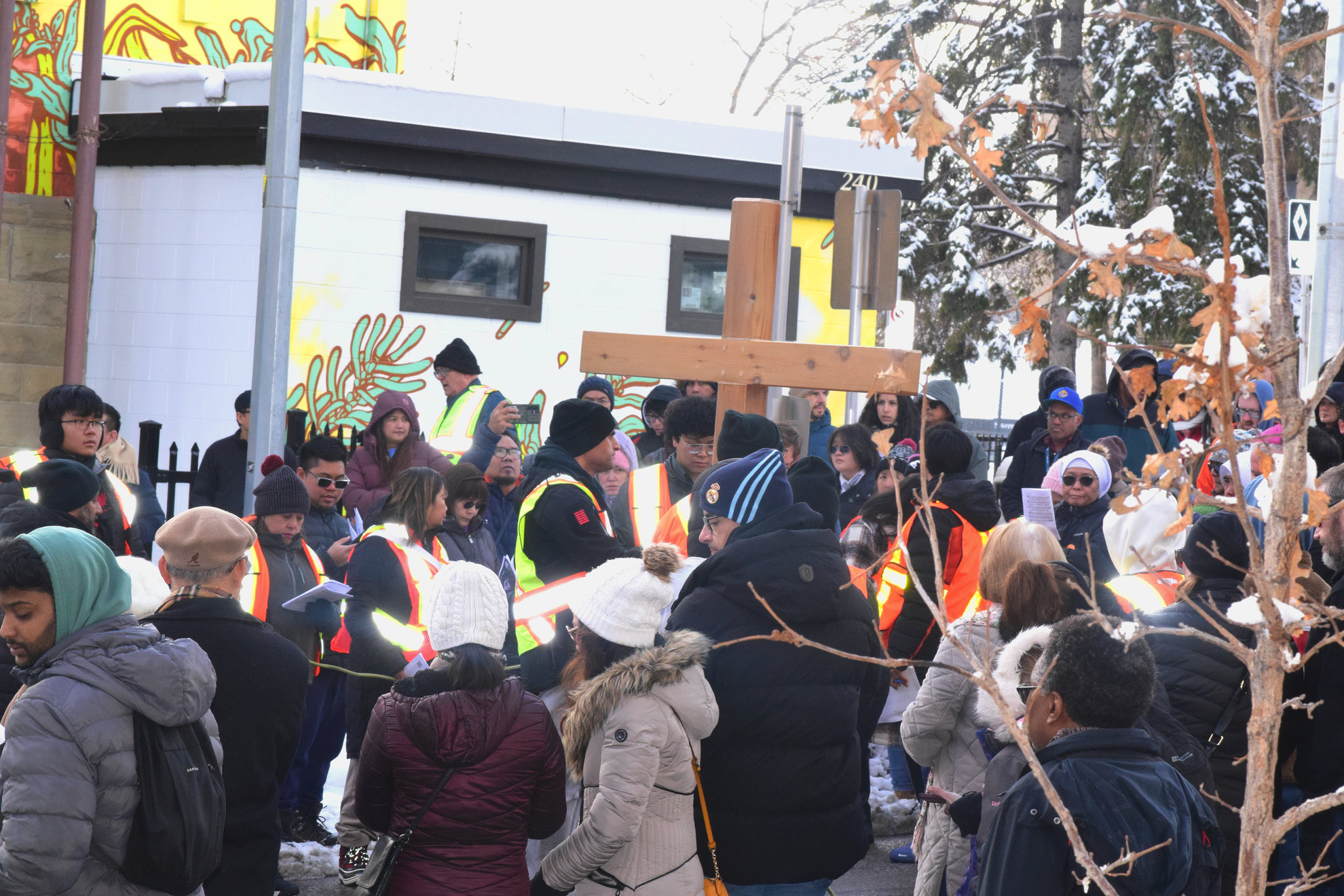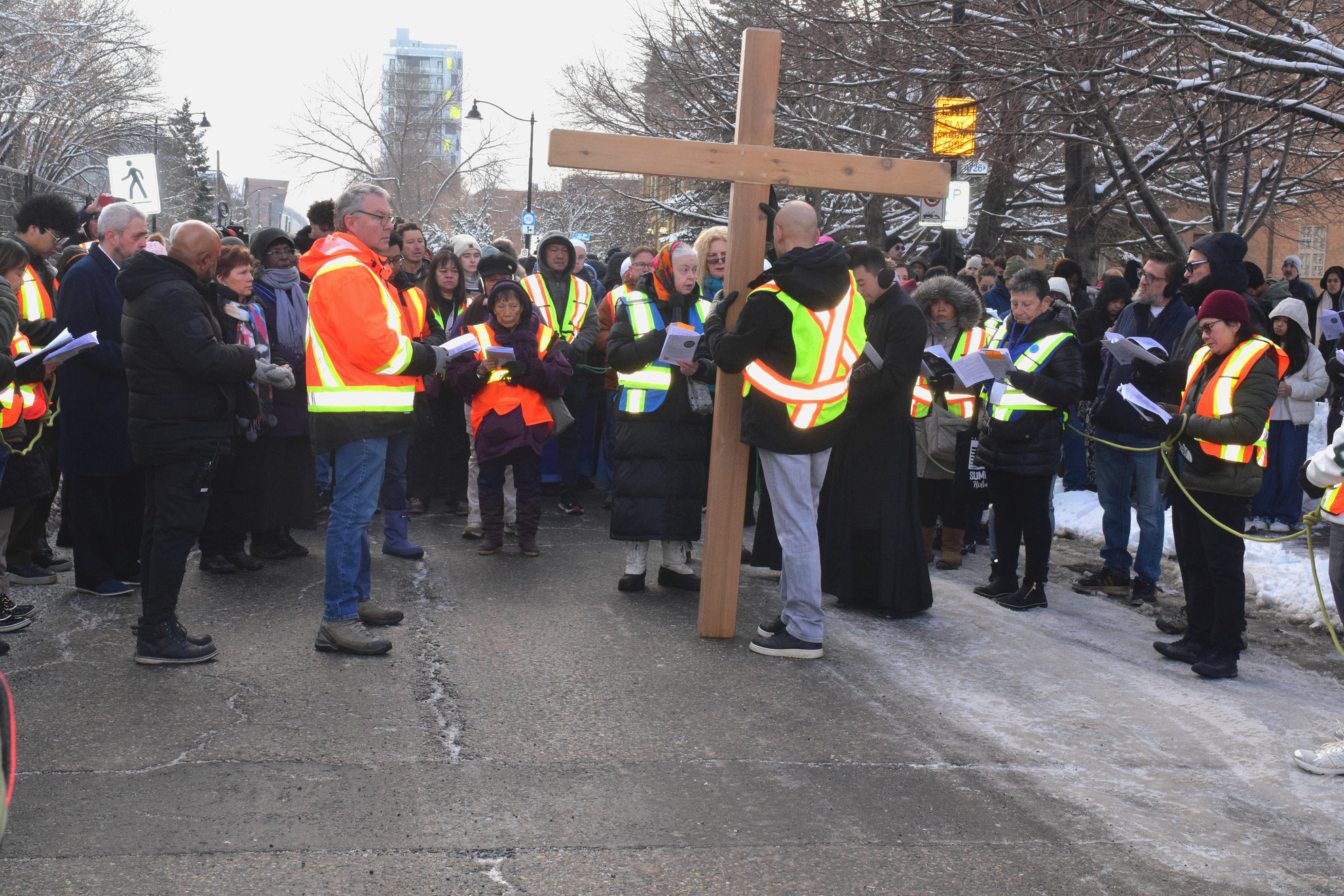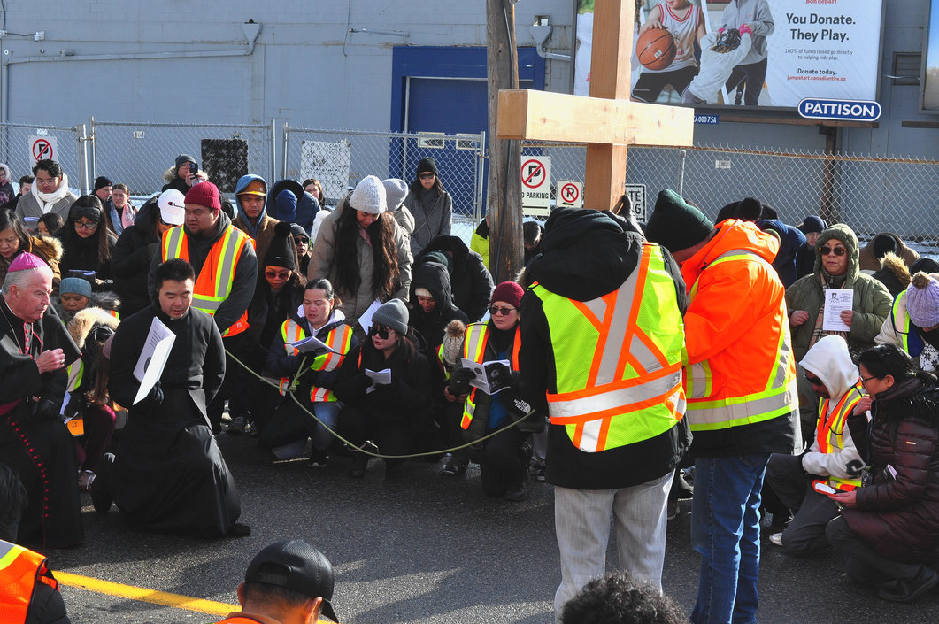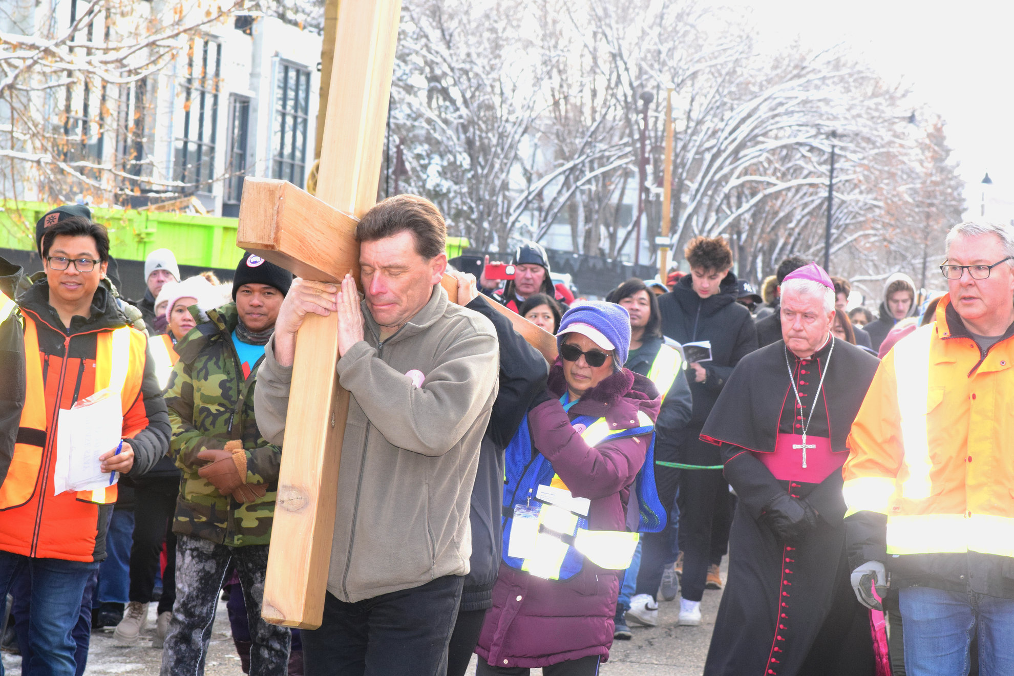 Good Friday morning, April 3rd in downtown Calgary began under cold skies and near-freezing temperatures, but the Outdoor Way of the Cross once again drew a very strong turnout. Attendance was comparable to 2025, with an estimated 2,000 to 3,000 people taking part. Before the procession began, Fr. Arjay led the volunteers in prayer.