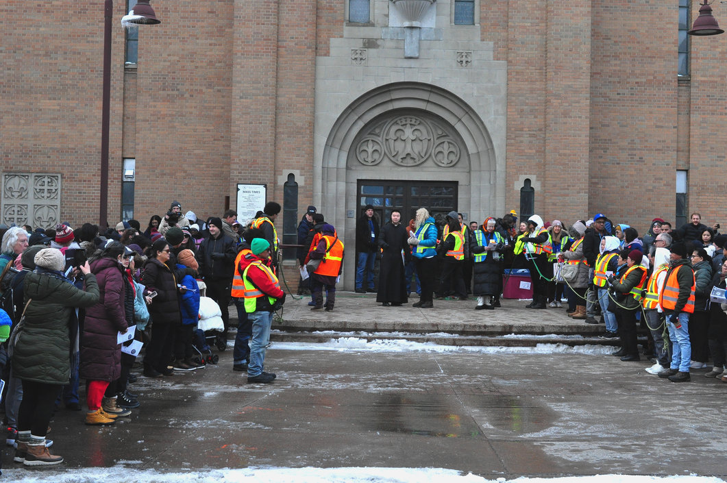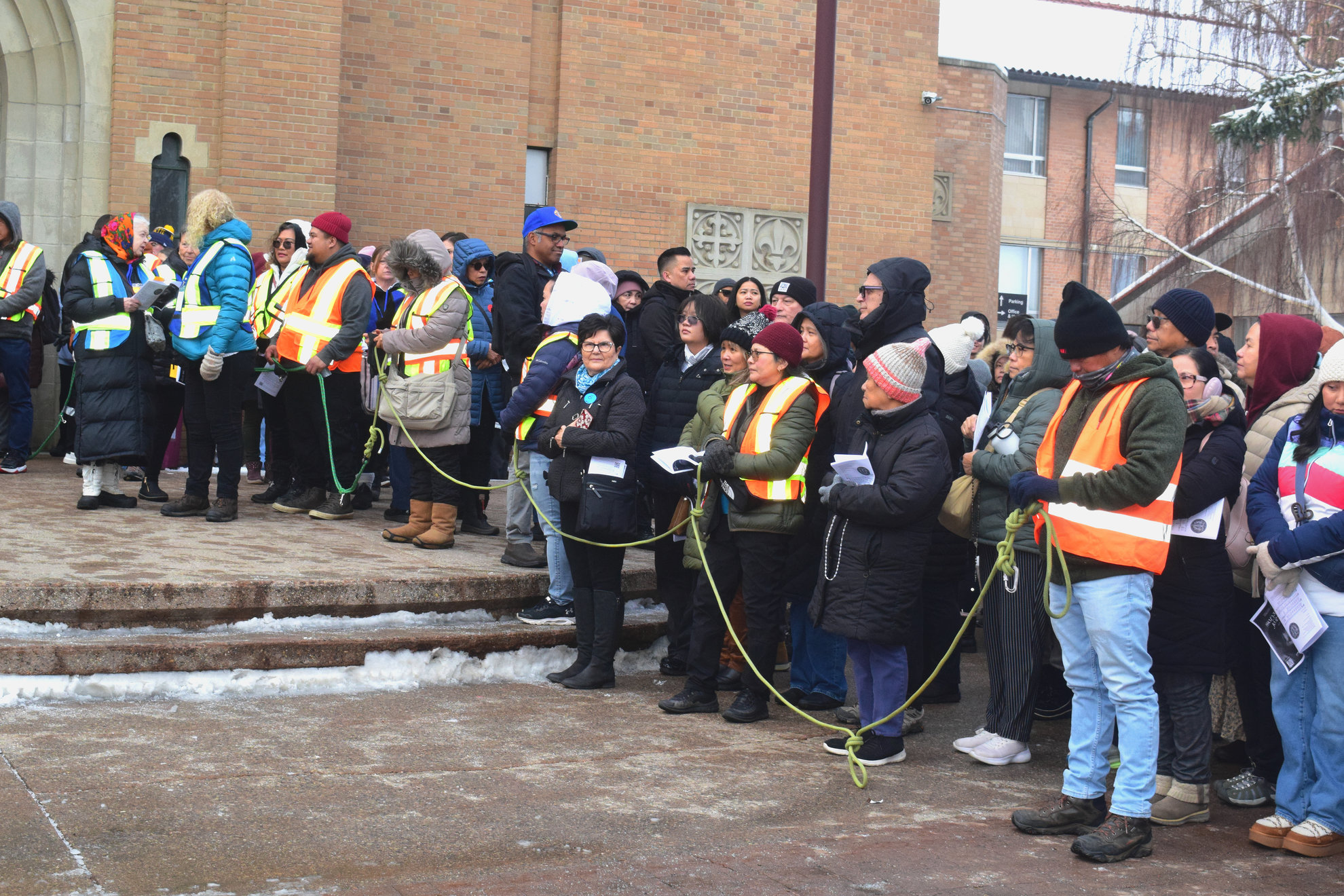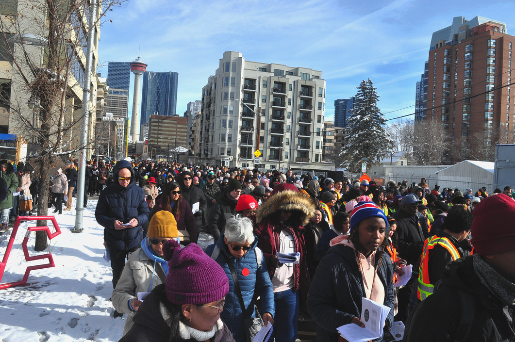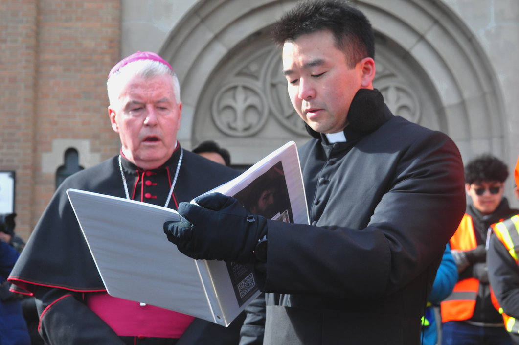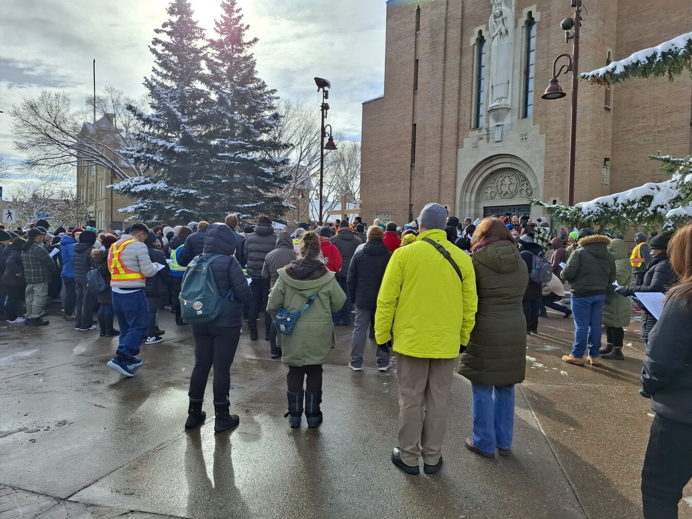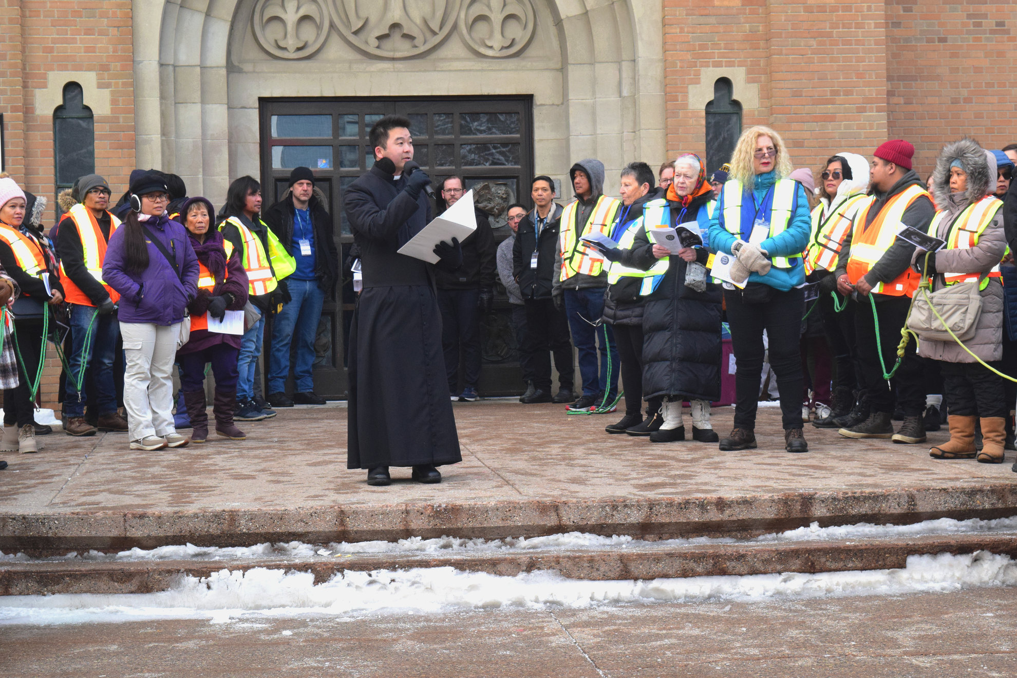 Good Friday morning, April 3rd in downtown Calgary began under cold skies and near-freezing temperatures, but the Outdoor Way of the Cross once again drew a very strong turnout. Attendance was comparable to 2025, with an estimated 2,000 to 3,000 people taking part. Before the procession began, Fr. Arjay led the volunteers in prayer.