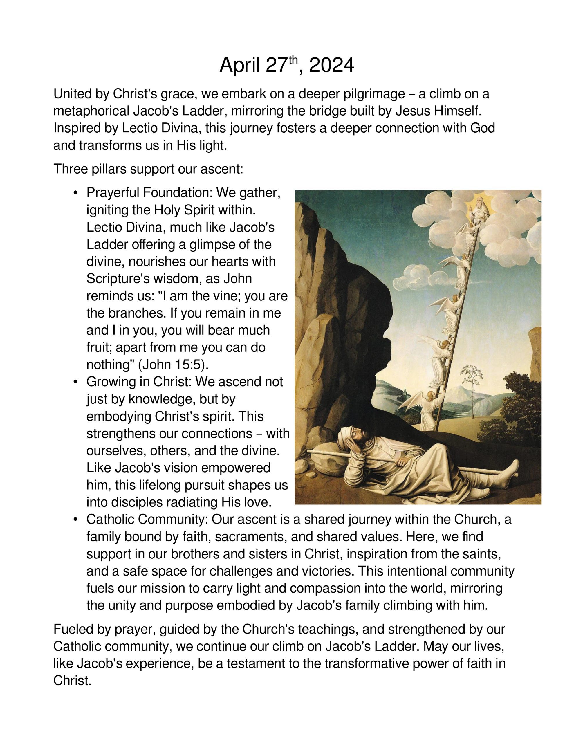 - Unity in Christ: Just as branches on a vine are unified by the lifeblood of the living vine, drawing sustenance from the same source, we, bound together as Knights of Columbus by our faith in Christ, are further united in this shared foundation. Through Lectio Divina, we will explore how this deeper unity strengthens our Christian fellowship and allows us to better serve our communities as instruments of God’s love.